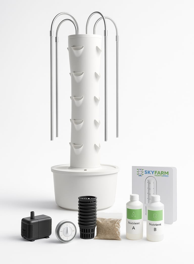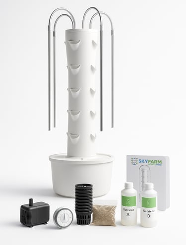 Il kit Skyfarm HOME arriva completo di tutto: torre modulare, pompa silenziosa, timer automatico, vasetti, substrato e nutrienti.