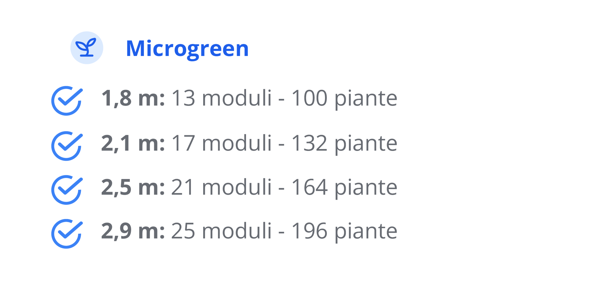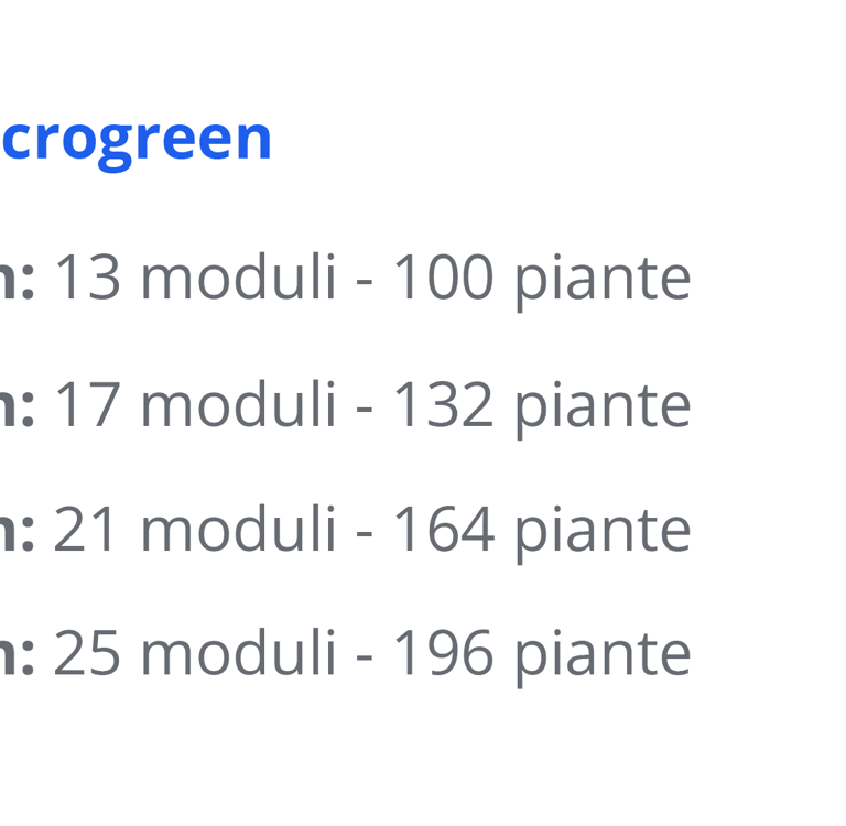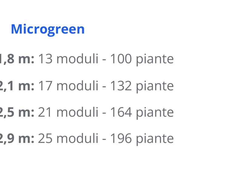 Skyfarm PRO si presenta con configurazioni modulari, adatte a ogni esigenza. I moduli di SkyFarm PRO si incastrano con facilità e possono essere adattati a ogni spazio. Puoi scegliere tra moduli standard per ortaggi ed erbe, e moduli specifici per microgreen ad alta densità.